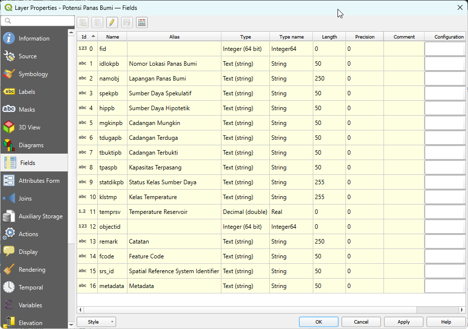 Dengan kolom namobj (Lapangan Panas Bumi), Anda dapat melakukan identifikasi nomenklatur prospek energi untuk inventarisasi portofolio wilayah kerja.