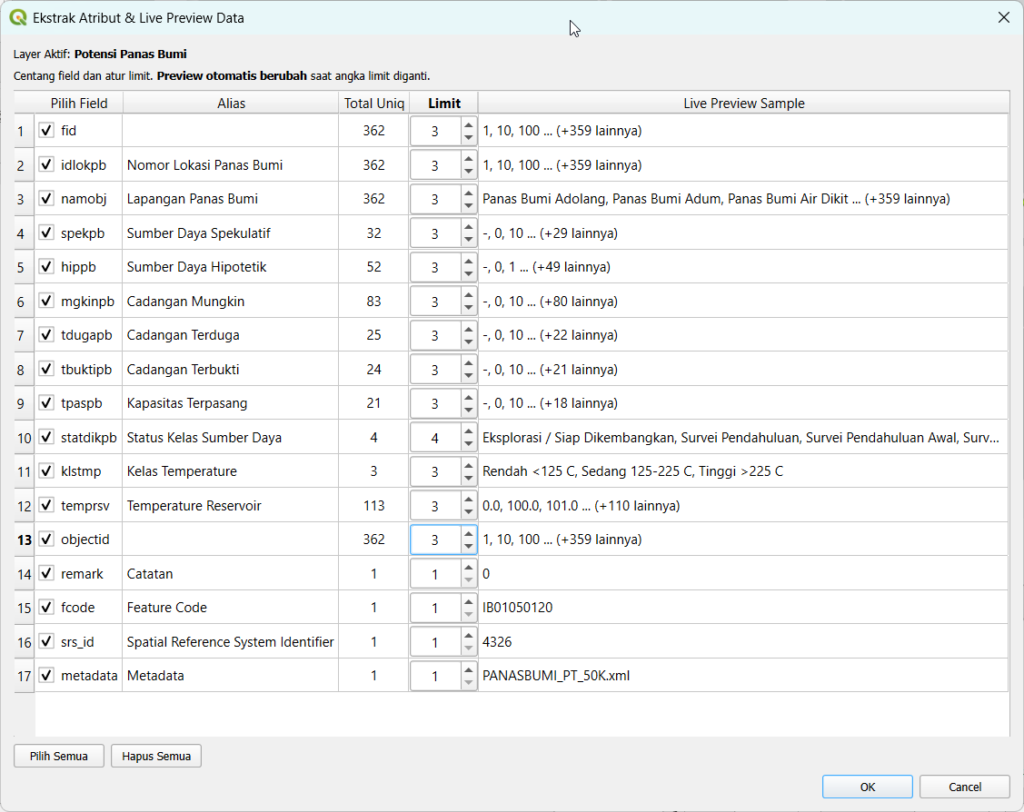 Dengan kolom klstmp (Kelas Temperature), Anda dapat melakukan klasifikasi sistem geotermal (rendah, sedang, tinggi) untuk menentukan jenis teknologi pembangkitan listrik yang relevan.
