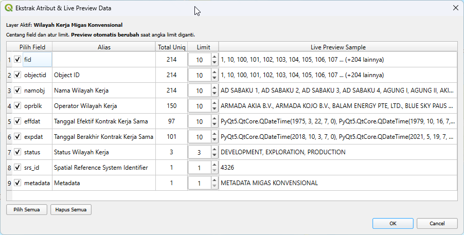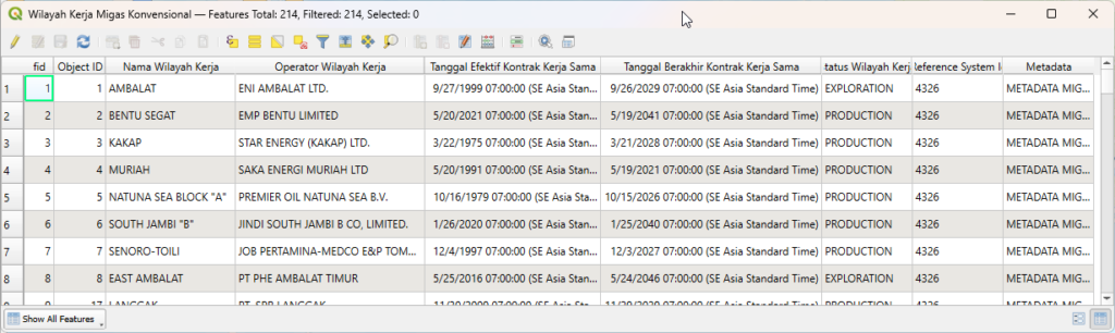 Dengan kolom namobj, Anda dapat melakukan pemetaan wilayah kerja spesifik untuk identifikasi dan lokalisasi batas area blok migas. Dengan kolom oprblk, Anda dapat melakukan klasifikasi pemegang hak partisipasi (participating interest) guna analisis stakeholder operasional. Dengan kolom effdat, Anda dapat melakukan analisis historis terkait dimulainya kegiatan eksplorasi atau eksploitasi dalam kontrak kerja sama. Dengan kolom expdat, Anda dapat melakukan pemodelan temporal untuk memproyeksikan masa terminasi dan siklus hidup sebuah blok konsesi. Dengan kolom status, Anda dapat melakukan kategorisasi tahapan blok (seperti terminasi, eksplorasi, atau produksi) dalam proses due diligence.